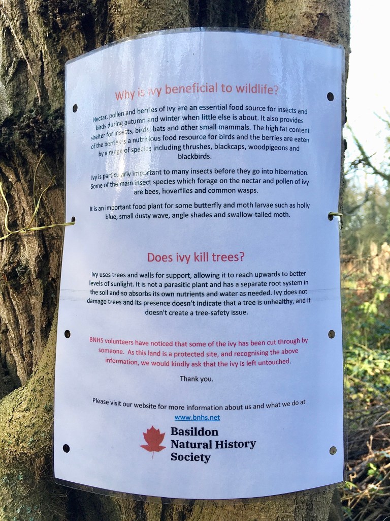 The BNHS volunteers have noticed that ivy is being cut from trees in Marks Hill Wood. Please refrain from doing this, or any other clearing, as Marks Hill is part of the Langdon SSSI and only authorised work is allowed by Natural England. We have put up informative notices in the wood.