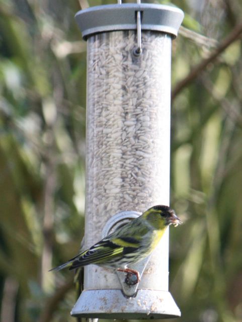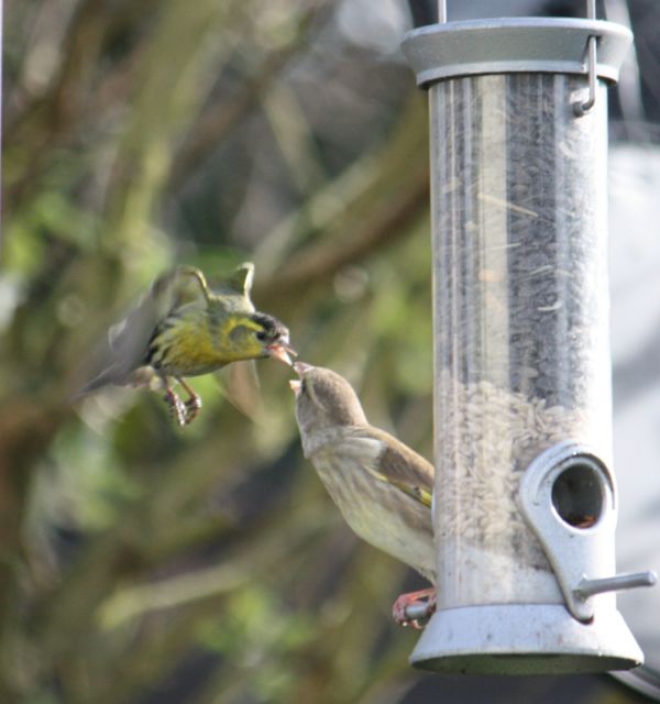 Siskin trying to chase a Greenfinch off the seed feeder – Photo: Colin Humphrey